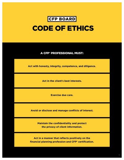 Each of our Advisors is also a CERTIFIED FINANCIAL PLANNER Professional. The CFP Board publishes a Code of Ethics (right) that each CFP Professional must abide by. This Code of Ethics includes, among other behaviors, acting in the clients best interest.